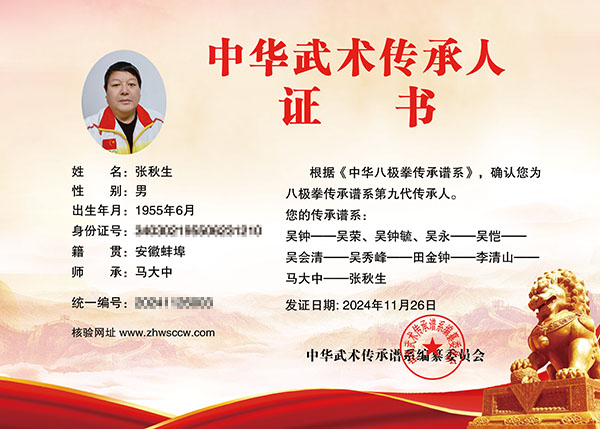 张秋生,1955出生,是八极拳第九代传承人,自动喜爱武术。1985年拜高拱辰老师学习形意拳,老师去世后于2006年10月跟随田氏八极拳马大中老师专心学习八极拳至今。