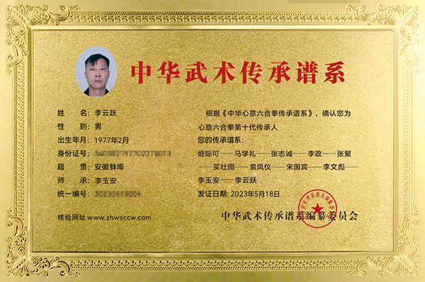 李云跃,安徽蚌埠人,师承李玉安——心意六合拳第十代传人,武术协会理事成员,荣获优秀教练员荣誉称号。