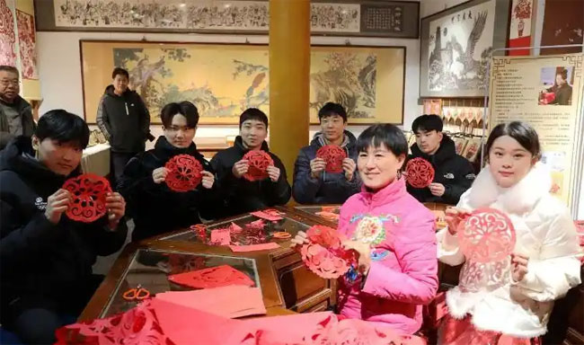 步入杨秀玲剪纸艺术馆,郓城剪纸非遗传承人杨秀玲与张璐正沉浸于“当哪吒遇见牡丹”系列作品的创作中。尹汝重(韩国)望着栩栩如生的哪吒形象与环绕其四周的绚烂牡丹,不禁对其精湛技艺发出由衷赞叹:“哇,哪吒,是很厉害很火爆的哪吒!”随后,杨秀玲向大家讲述了剪纸的基础知识与简易操作技巧,以纸为媒,带领众人体验“阴阳镂刻”之妙。彩纸翻飞间,韩国友人们化身“非遗学徒”,全神贯注地投入到“剪窗花”这一传统习俗的创作之中。