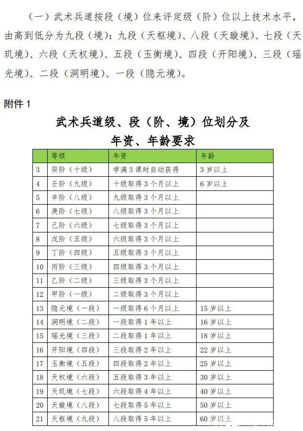 看到这些名称你是不是很熟悉?是不是以为是为想写小说做的功课?其实都不是,这些是前段时间中国武术协会发布的段位划分标准名称。这些段位名称以前大家都是在网络小说中看到,但是这次是真的在你身边,说不定你身边就有一个天枢境的高手在暗中保护着你这位“逆天主角”。5月31日体育总局武术中心发布通知,向公众征求对《武术兵道项目管理制度》的意见。其中有部分内容是“中国武术协会武术兵道级、段(阶、境)位实施细则”。下面是具体段位划分图
