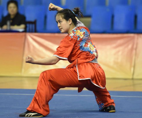 ⑥气沉丹田,发声吐气。南拳常配合发力因势发出喊声,这有助于使动作饱满刚健,突出南拳的刚烈风格。